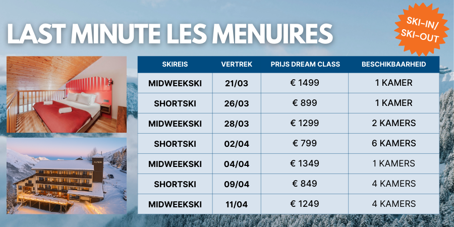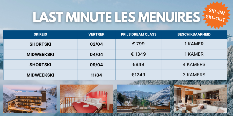 Waarom Les Menuires? Les Menuires ligt middenin het legendarische Les Trois Vallées, het grootste aaneengesloten skigebied ter wereld met meer dan 600 km pistes. Vanuit Les Menuires kun je moeiteloos de hele vallei verkennen — inclusief de hoge bergen rond Val Thorens, dat tot begin mei geopend blijft voor skiën! Sneeuwzekerheid = gegarandeerd!